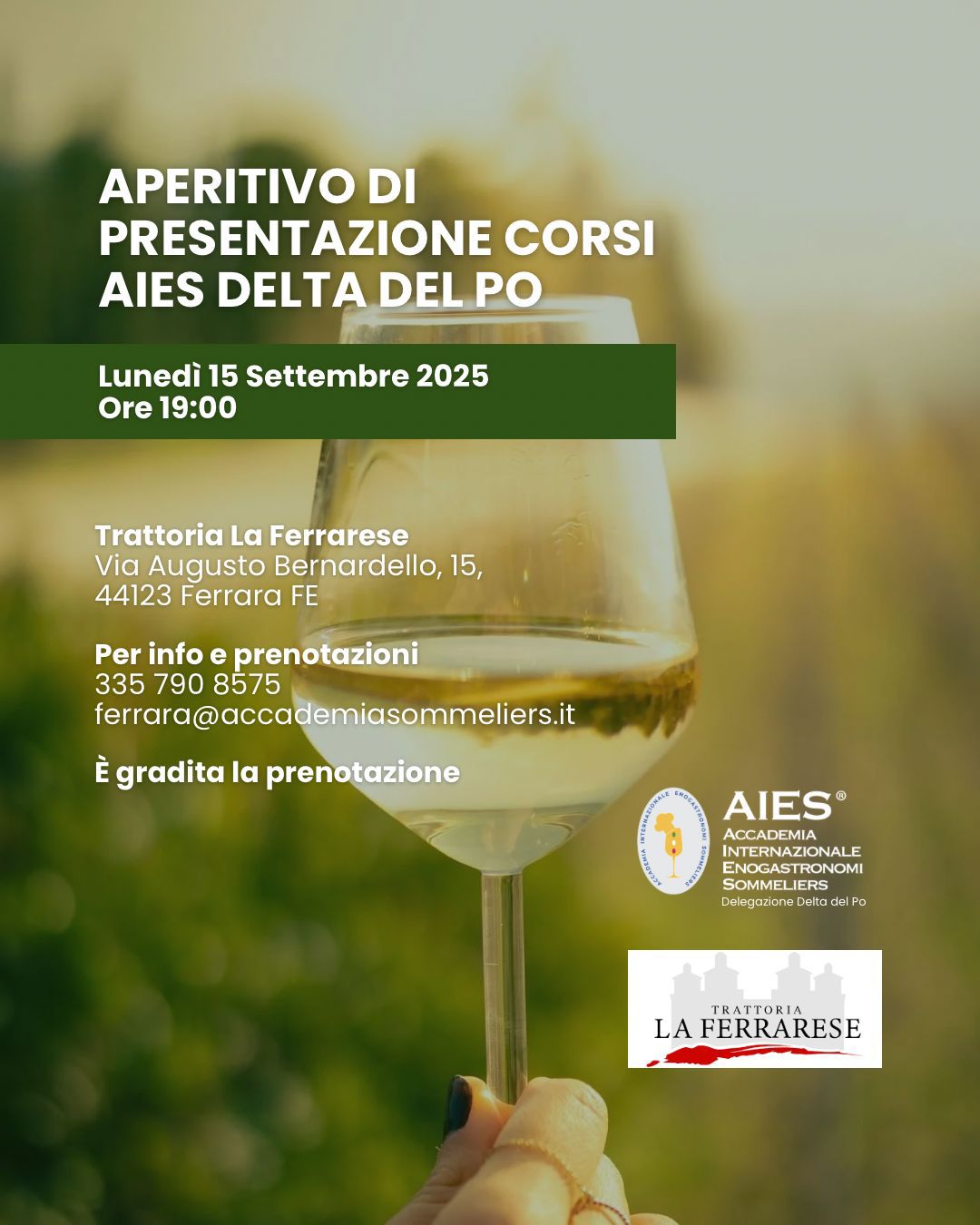 AIES Delta del Po ti invita all’aperitivo di presentazione dei corsi da Sommelier Enogastronomo: un’occasione speciale per incontrarci, brindare insieme e scoprire tutte le novità in programma.