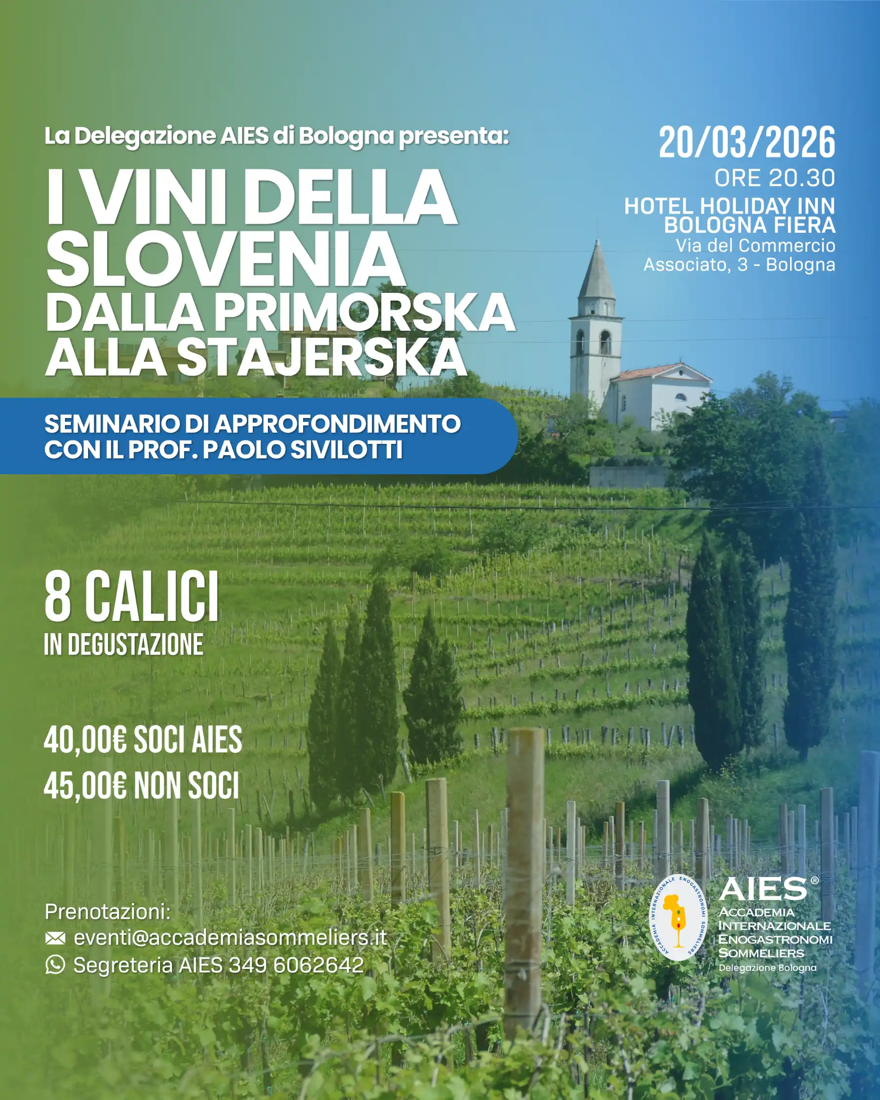 La Delegazione AIES di Bologna è lieta di presentare per la prima volta una serata di approfondimento dedicata ai vini della Slovenia condotta dal Prof. Paolo Sivilotti dell’Università di Udine. Avremo modo di conoscere nel dettaglio le caratteristiche della tradizione vinicola slovena attraverso un vero e proprio seminario accompagnato dalla degustazione di 8 referenze provenienti da tutte le regioni vinicole del paese.
