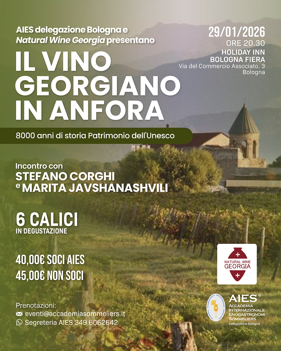 Una degustazione immersiva dedicata alla scoperta del vino naturale georgiano, culla di 8.000 anni di tradizione enologica e patria del metodo Qvevri, riconosciuto dall’UNESCO. Un percorso formativo che unisce competenza tecnica, cultura del territorio ed esperienza sensoriale professionale, condotto da due protagonisti dal respiro internazionale.